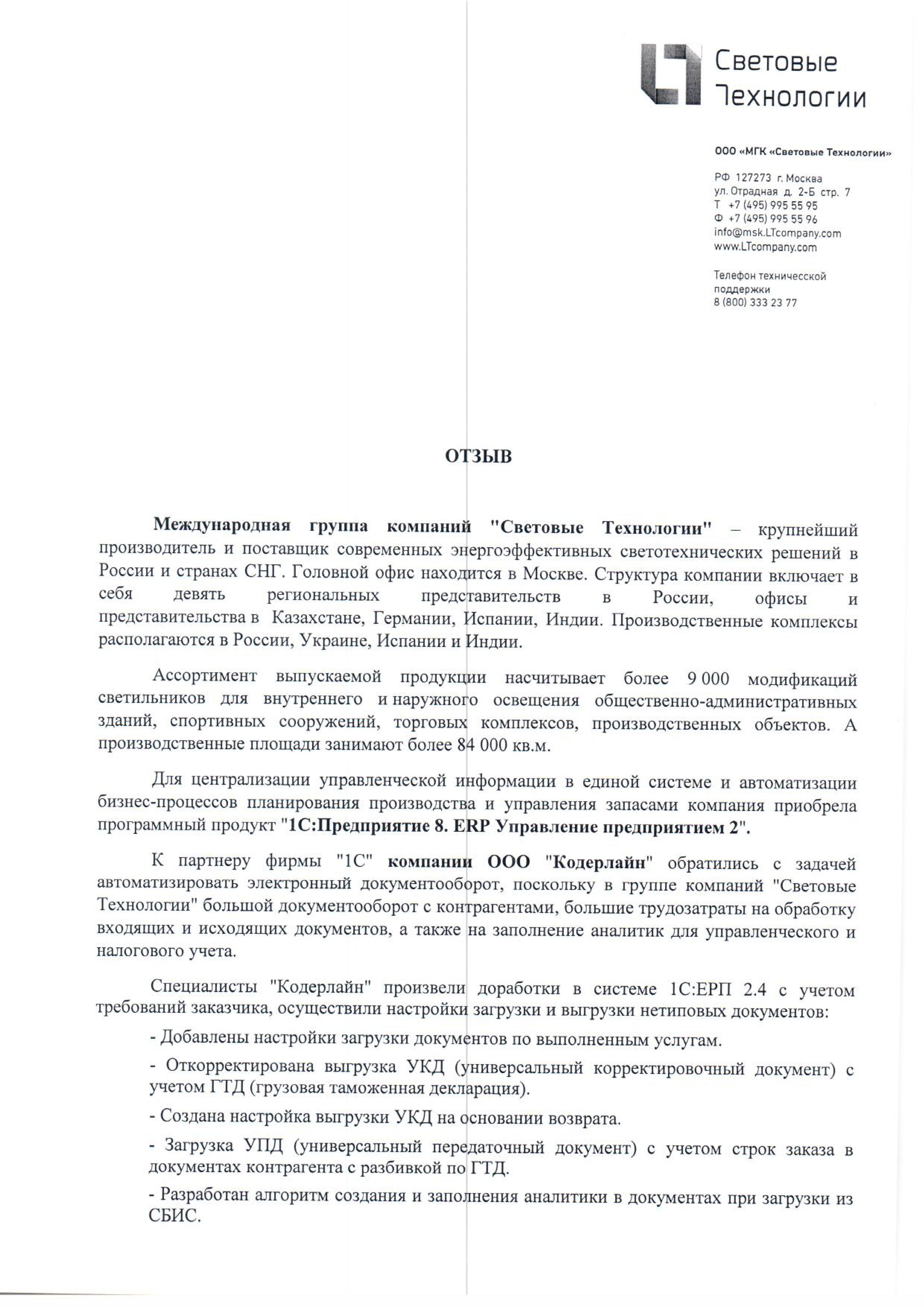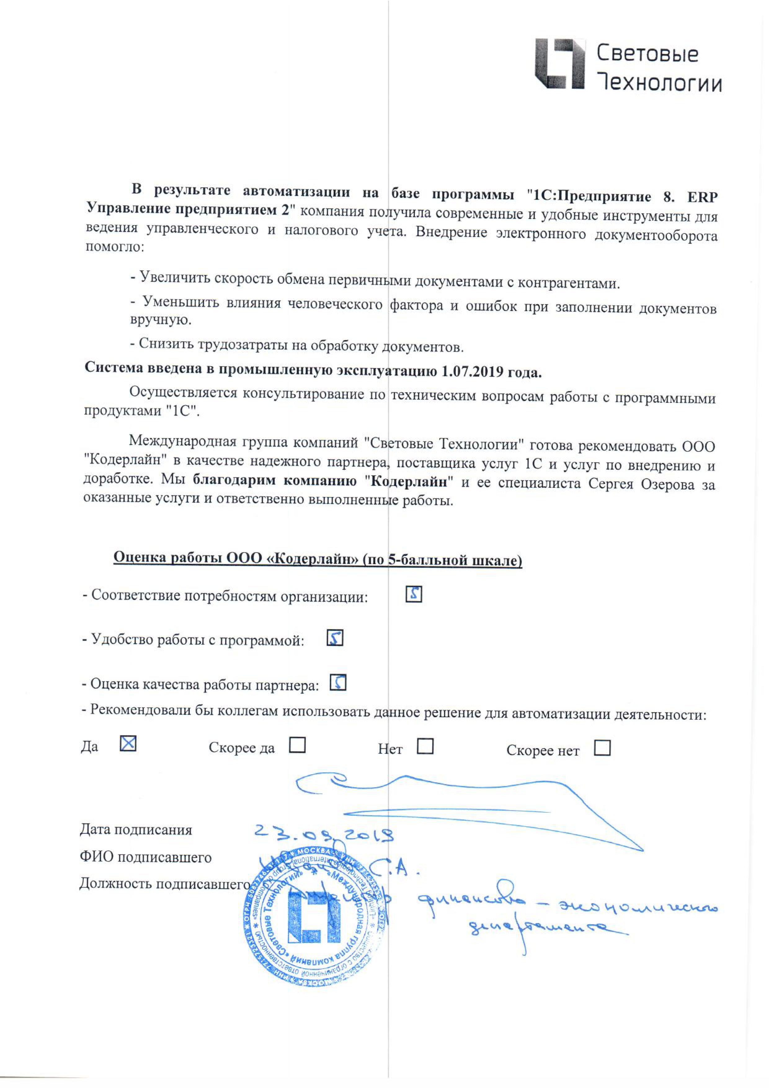 Международная группа компаний "Световые Технологии" готова рекомендовать ООО "Кодерлайн" в качестве надежного партнера, поставщика услуг 1С и услуг по внедрению и доработке. Мы благодарим компанию "Кодерлайн" и ее специалиста Сергея Озерова за оказанные услуги и ответственно выполненные работы.