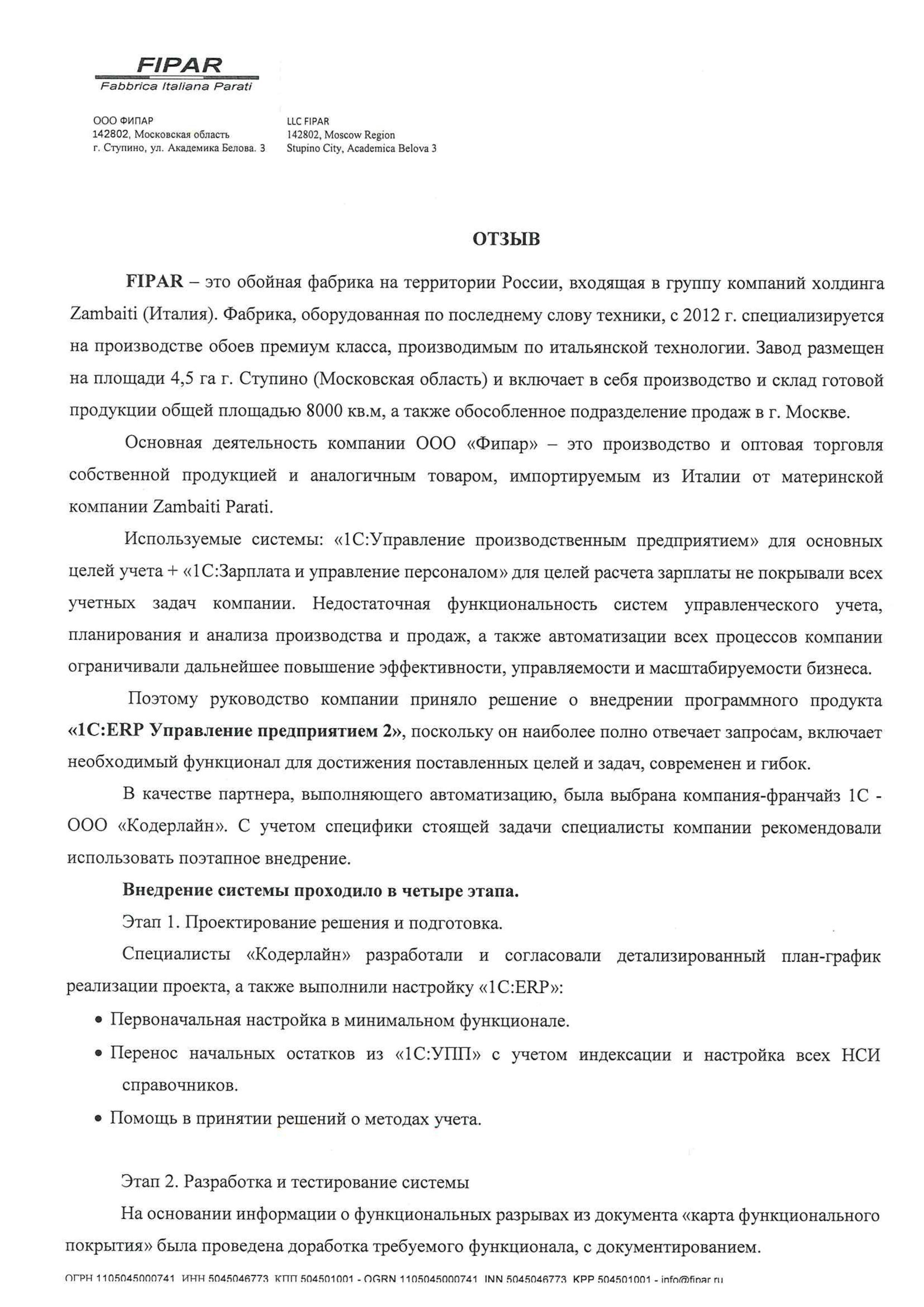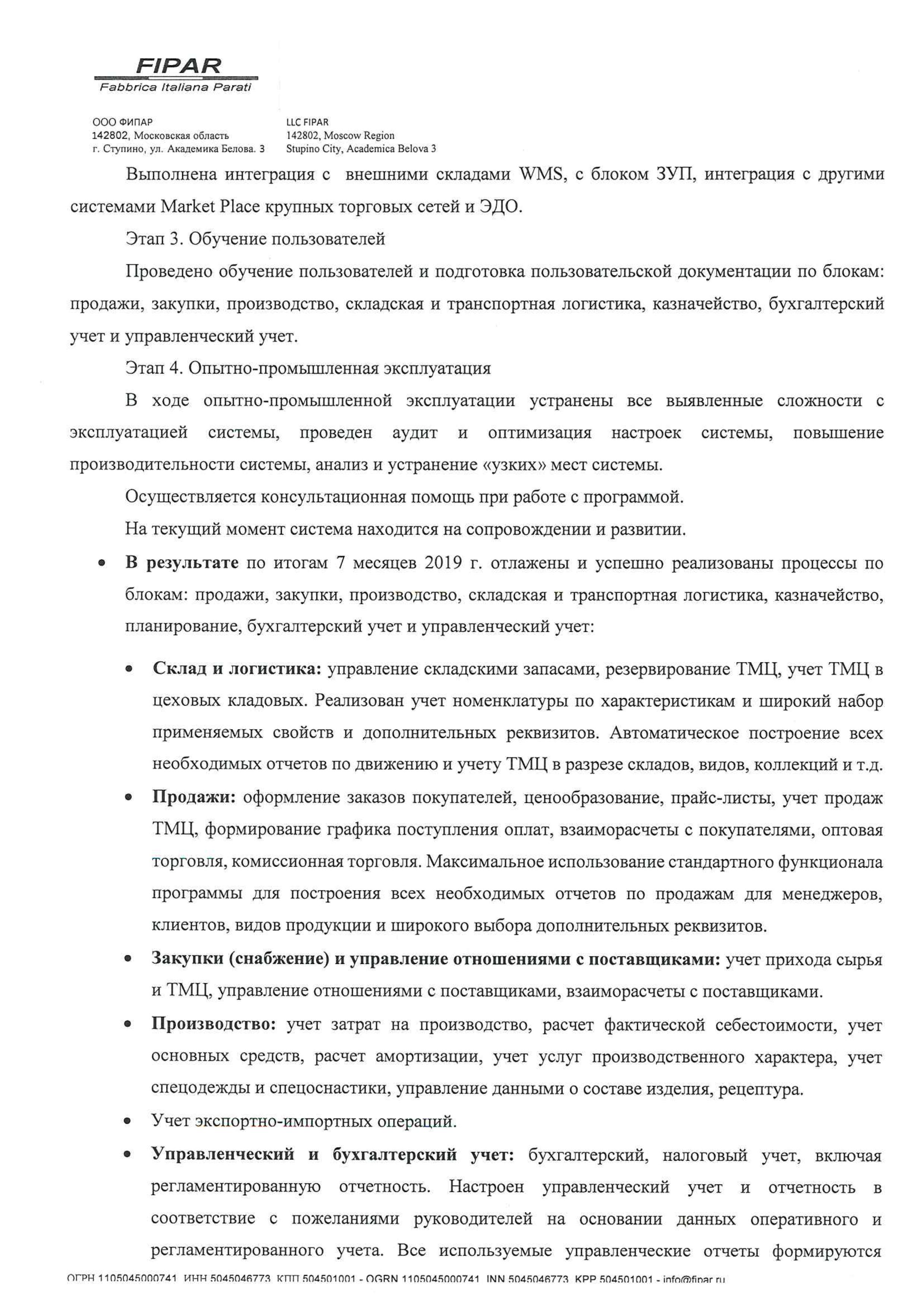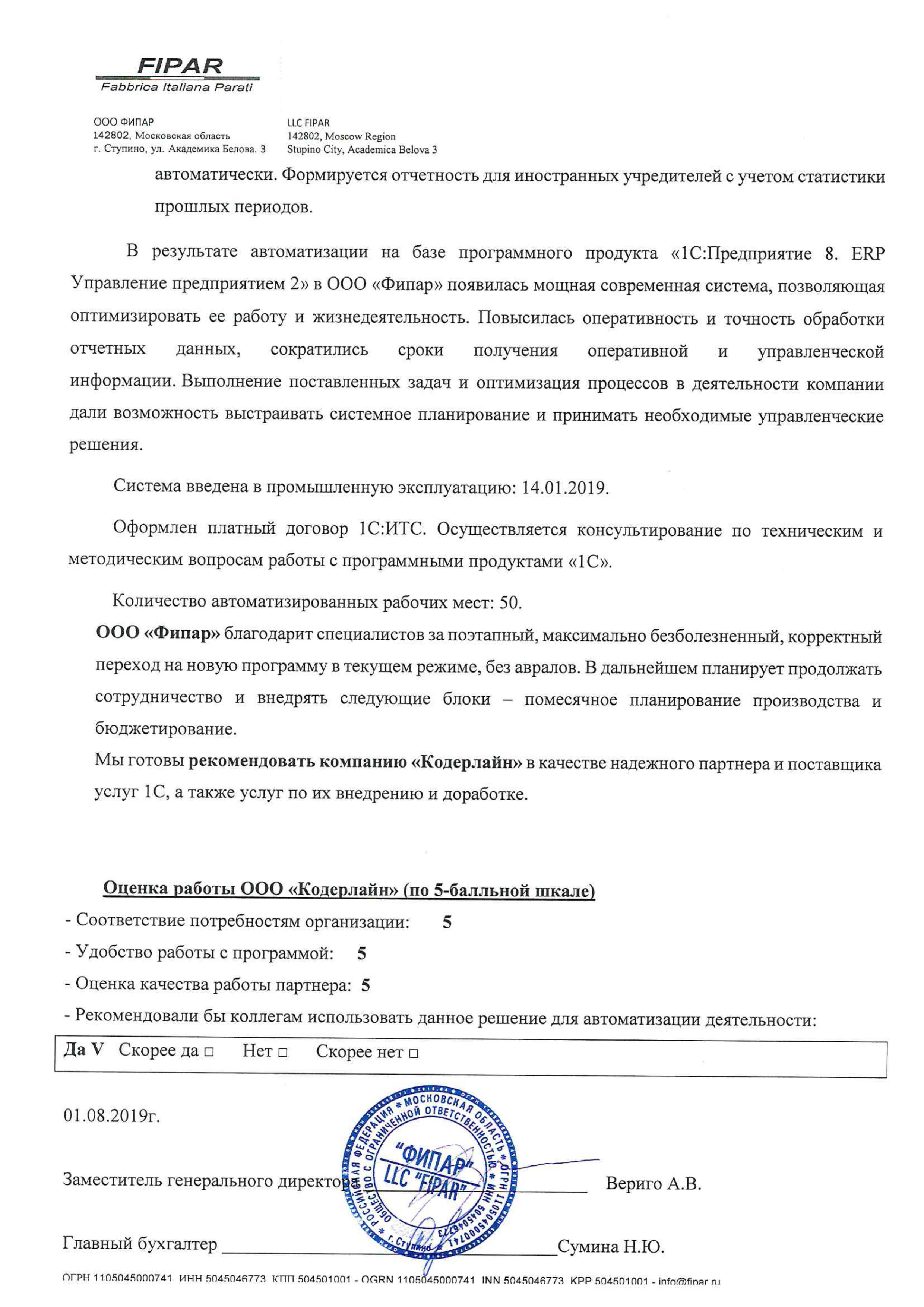 ООО «Фипар» благодарит специалистов за поэтапный, максимально безболезненный, корректный переход на новую программу в текущем режиме, без авралов. В дальнейшем планирует продолжать сотрудничество и внедрять следующие блоки – помесячное планирование производства и бюджетирование.