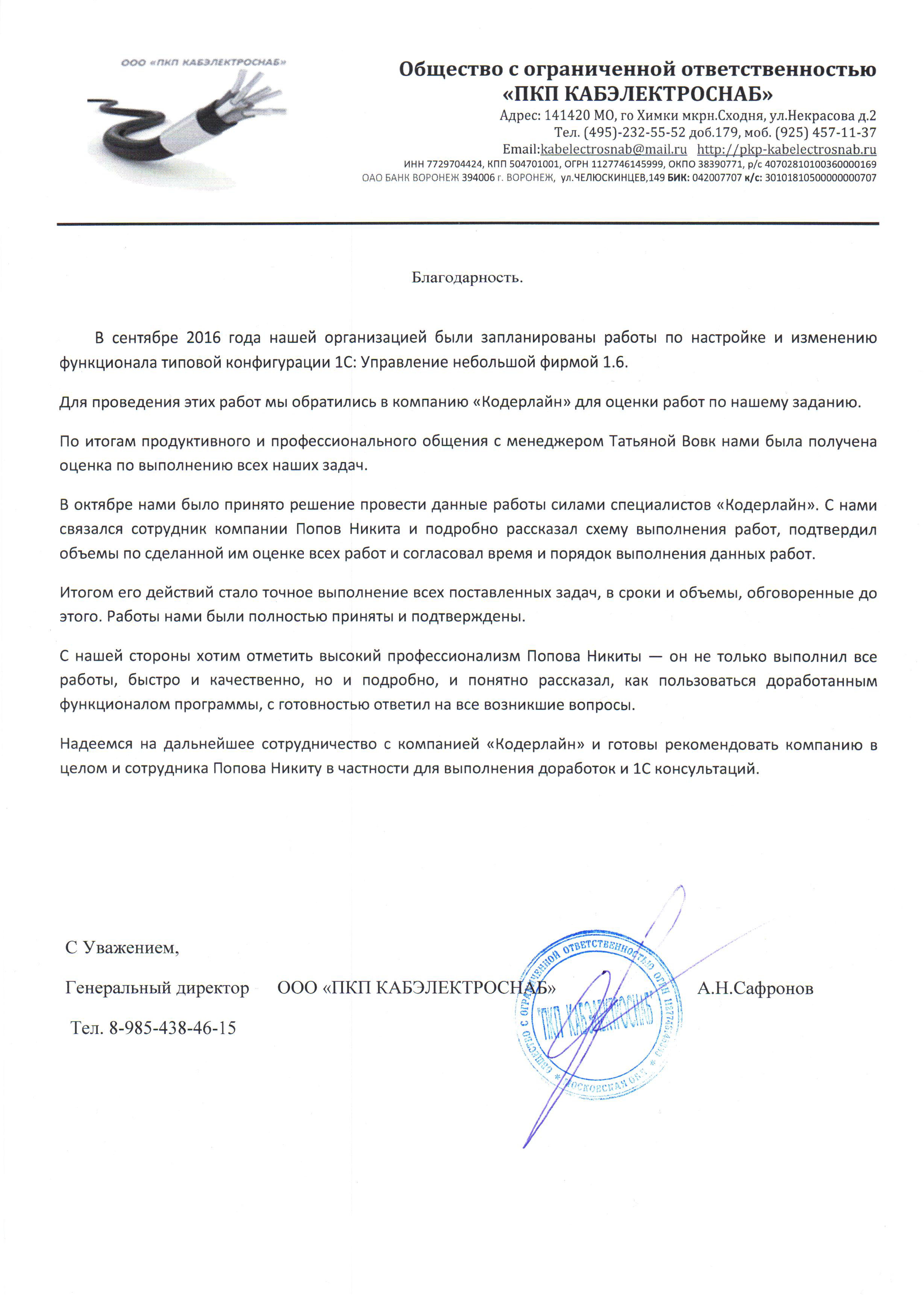 В адрес «Кодерлайн» пришло благодарственное письмо (отзыв) от клиента – ООО «ПКП КАБЭЛЕКТРОСНАБ» по итогам работ, выполненных сотрудником нашей компании по настройке и изменению функционала типовой конфигурации «1С:Управление небольшой фирмой 1.6». Очень приятные слова, спасибо!