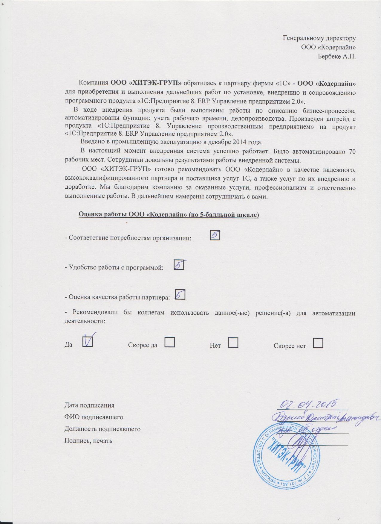 ООО «ХИТЭК-ГРУП» готово рекомендовать ООО «Кодерлайн» в качестве надежного, высококвалифицированного партнера и поставщика услуг 1С, а также услуг по их внедрению и доработке. Мы благодарим компанию за оказанные услуги, профессионализм и ответственно выполненные работы. В дальнейшем намерены сотрудничать с вами.