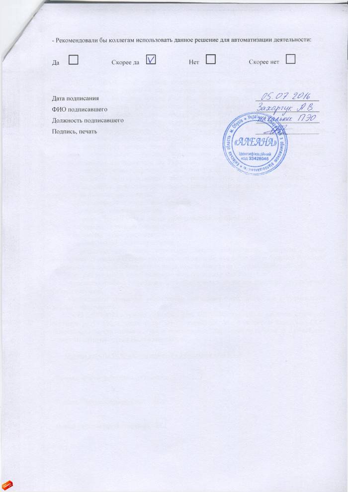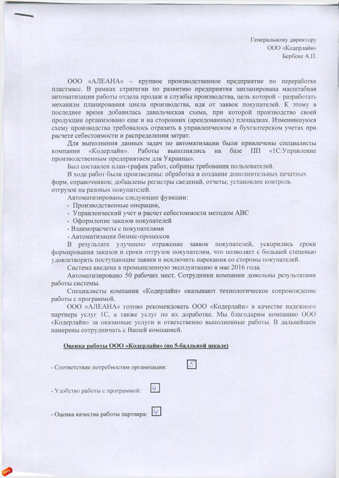 ООО «АЛЕАНА» готово рекомендовать ООО «Кодерлайн» в качестве надежного партнера услуг 1С, а также услуг по их доработке. Мы благодарим компанию ООО «Кодерлайн» за оказанные услуги и ответственно выполненные работы. В дальнейшем намерены сотрудничать с Вашей компанией.