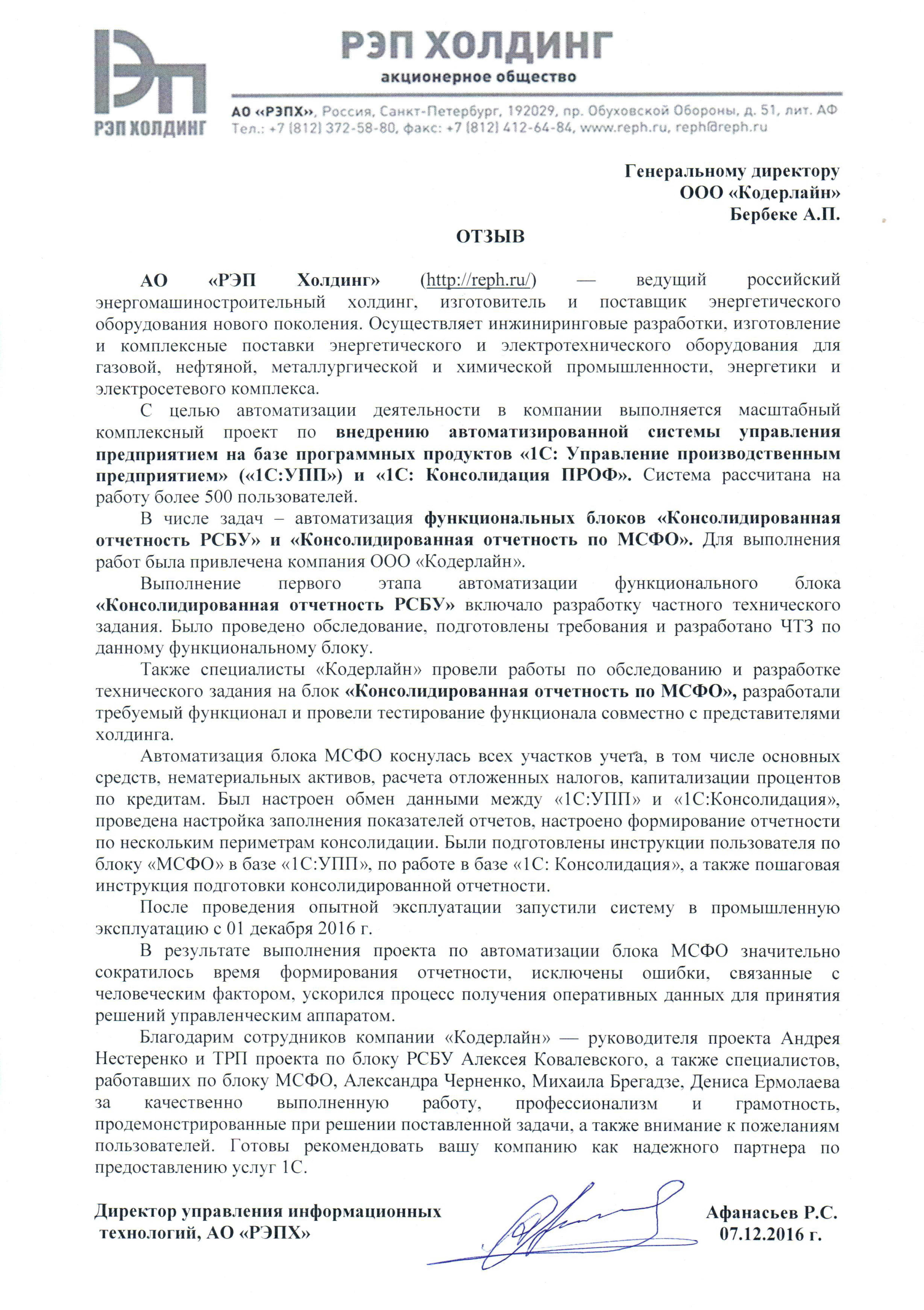В адрес компании «Кодерлайн» пришел отзыв от руководства АО «РЭП Холдинг» по итогам внедрения программных продуктов «1С: Управление производственным предприятием» («1С:УПП») и «1С:Консолидация ПРОФ». В нем говорится:
