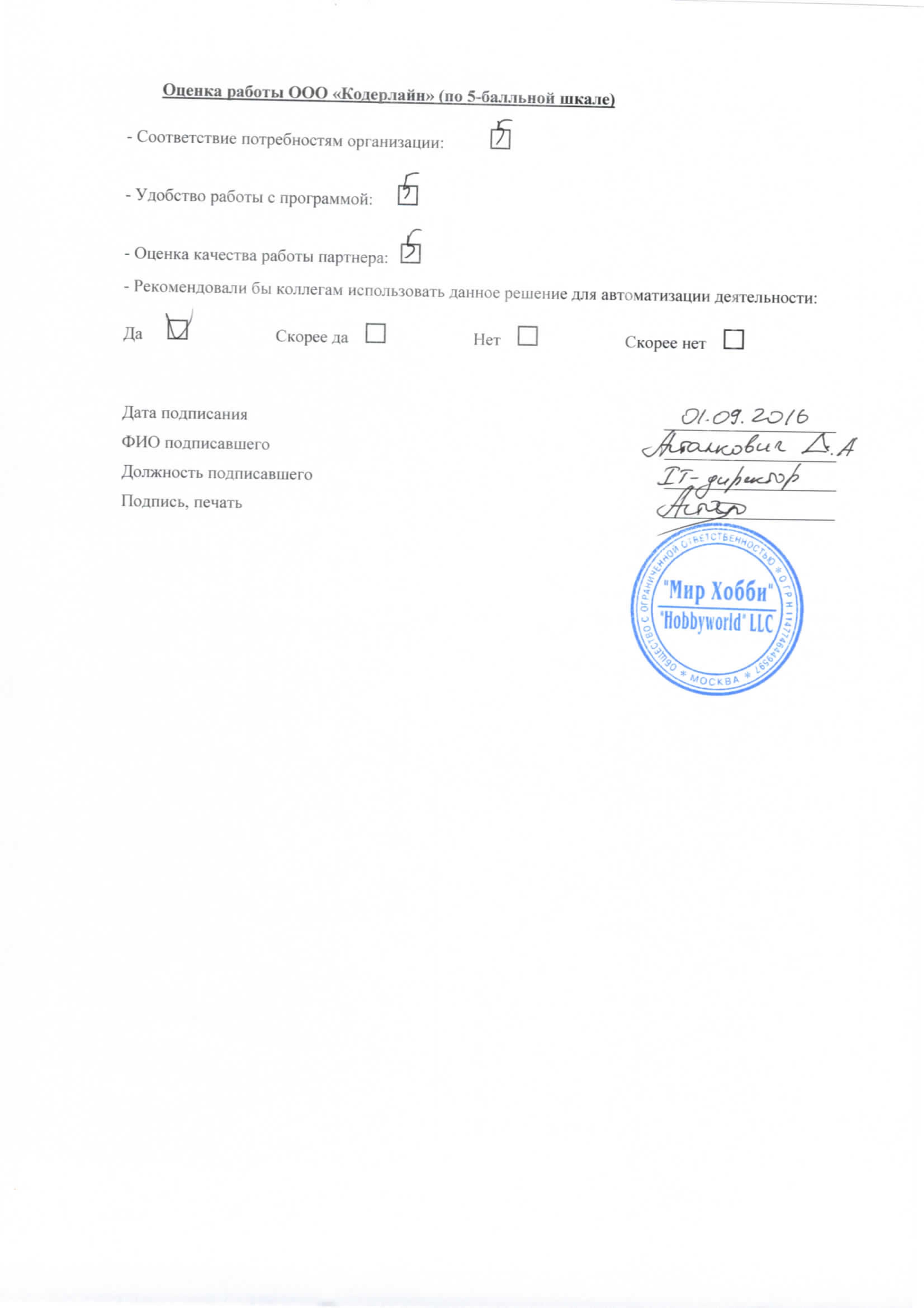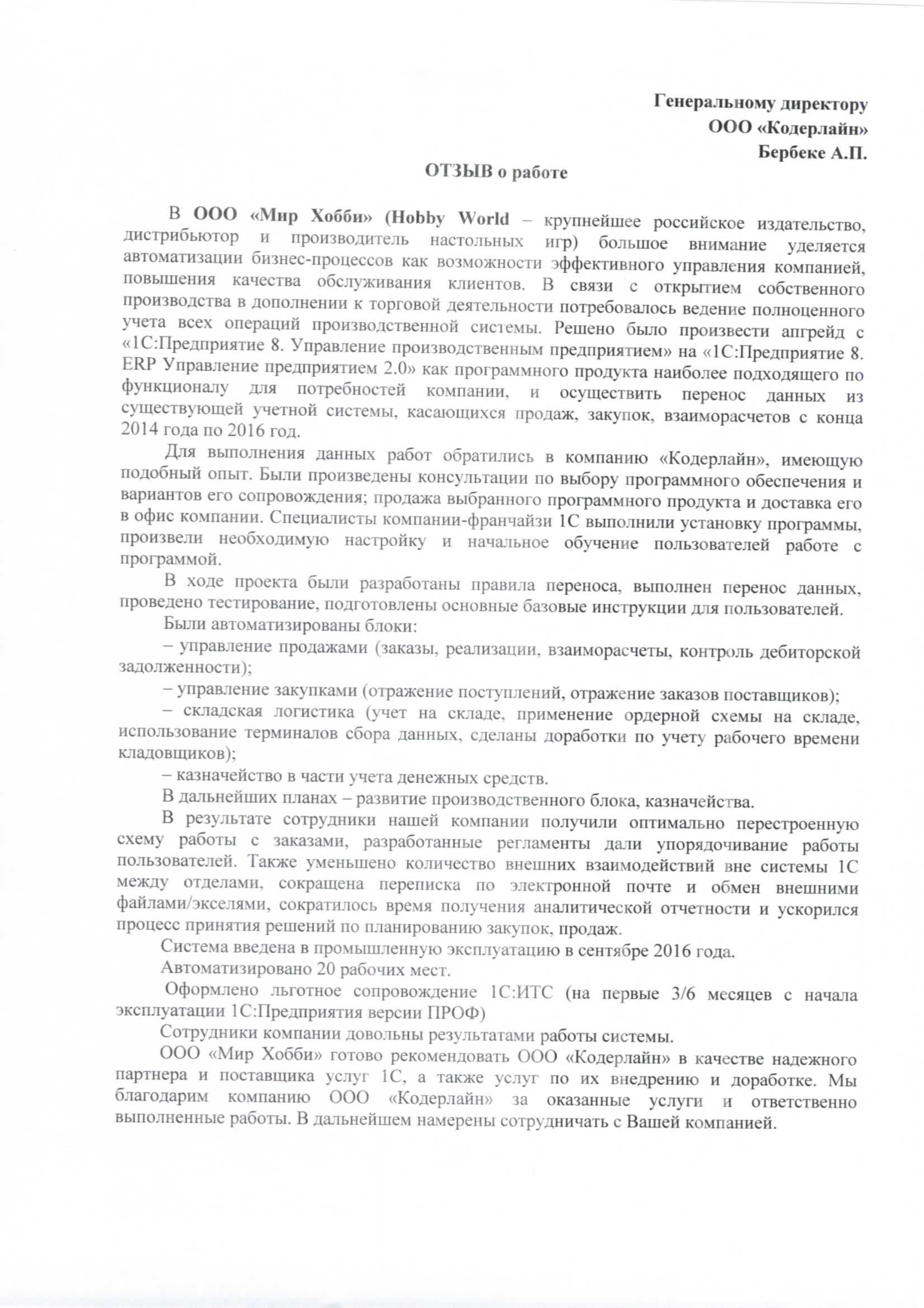 В ООО «Мир Хобби» (Hobby World – крупнейшее российское издательство, дистрибьютор и производитель настольных игр) большое внимание уделяется автоматизации бизнес-процессов как возможности эффективного управления компанией, повышения качества обслуживания клиентов. В связи с открытием собственного производства в дополнении к торговой деятельности потребовалось ведение полноценного учета всех операций производственной системы. Решено было произвести апгрейд с «1С:Предприятие 8. Управление производственным предприятием» на «1С:Предприятие 8. ERP Управление предприятием 2.0» как программного продукта наиболее подходящего по функционалу для потребностей компании, и осуществить перенос данных из существующей учетной системы, касающихся продаж, закупок, взаиморасчетов с конца 2014 года по 2016 год. Для выполнения данных работ обратились в компанию «Кодерлайн», имеющую подобный опыт. Были произведены консультации по выбору программного обеспечения и вариантов его сопровождения; продажа выбранного программного продукта и доставка его в офис компании. Специалисты компании-франчайзи 1С выполнили установку программы, произвели необходимую настройку и начальное обучение пользователей работе с программой.