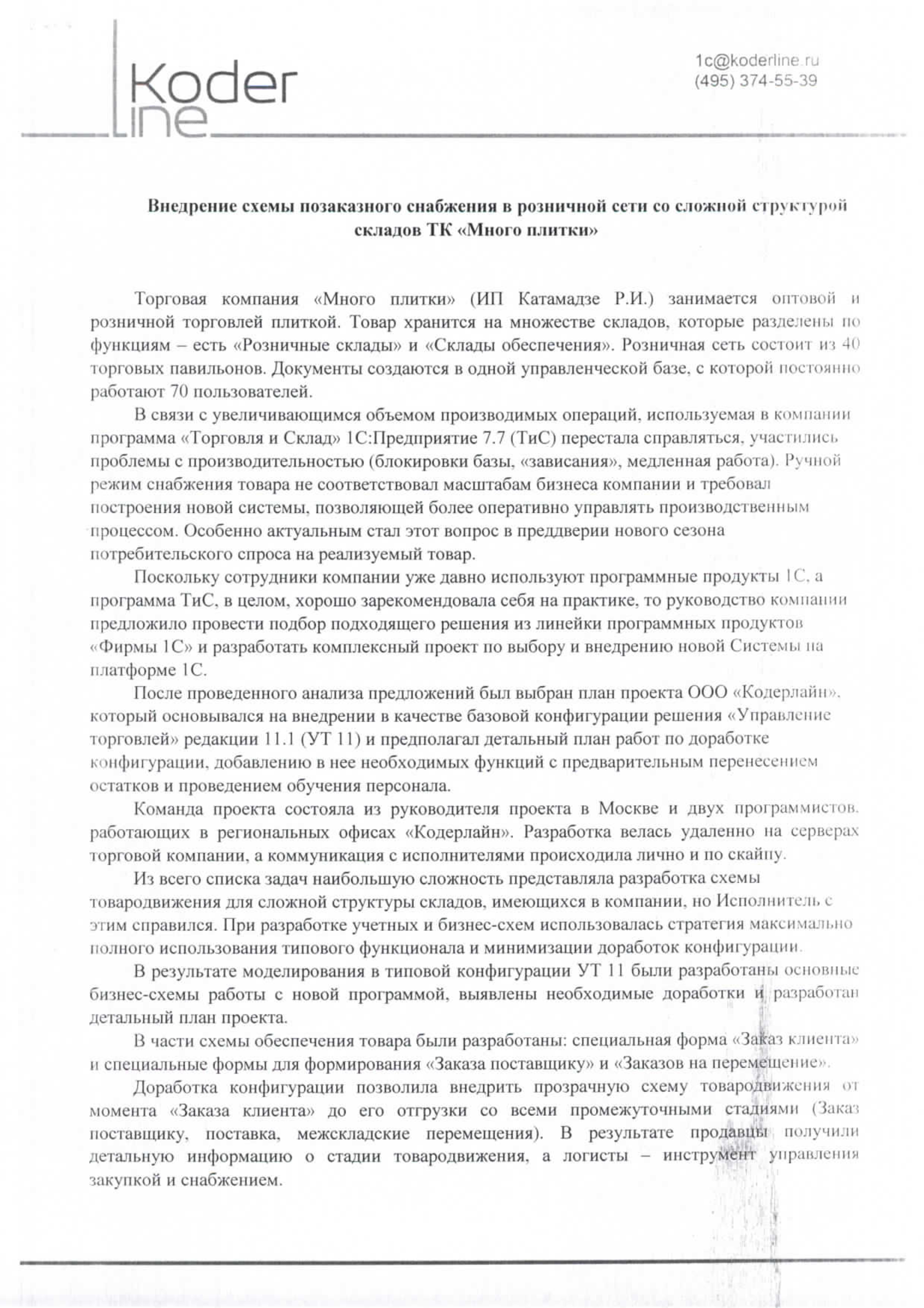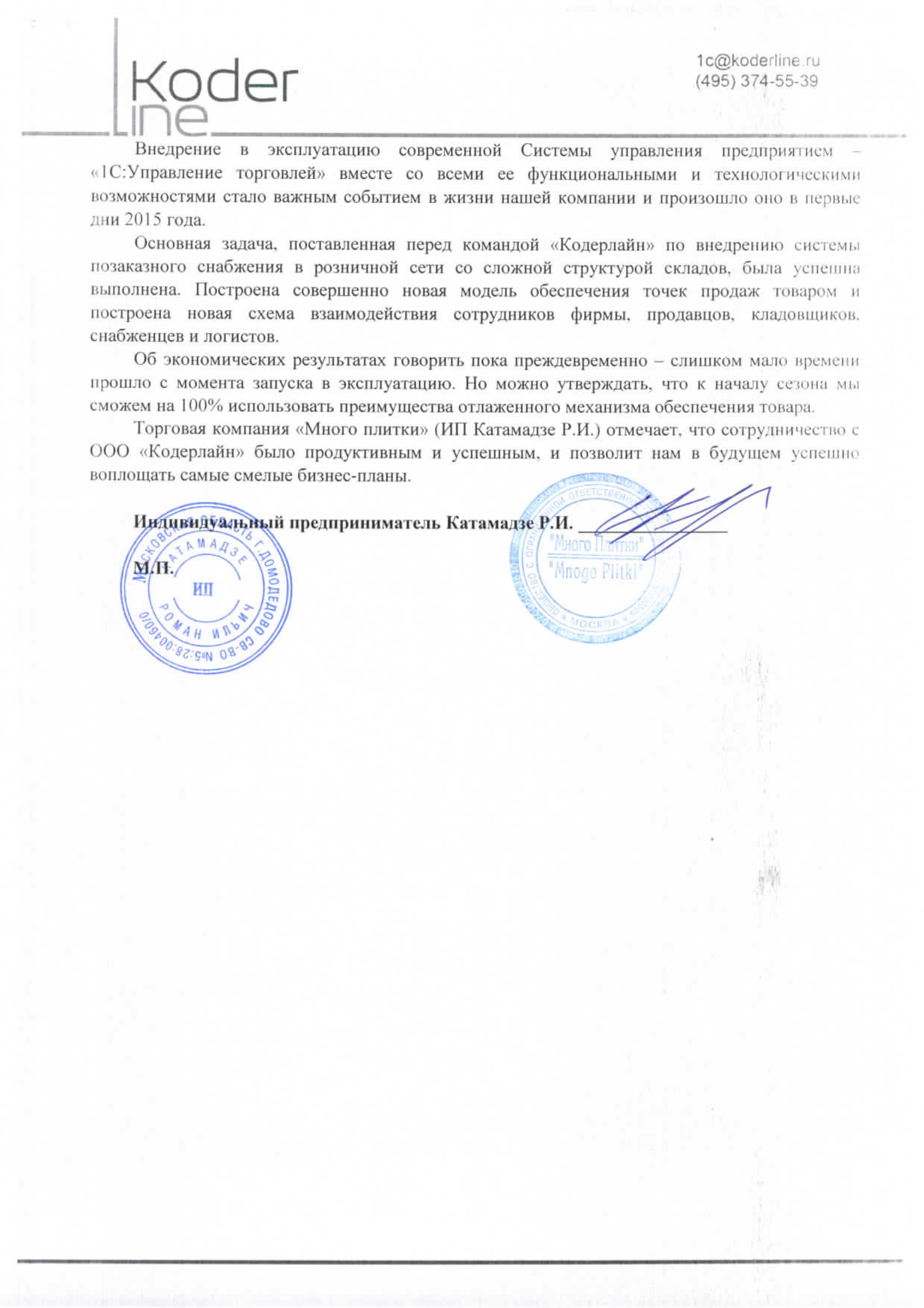 Торговая компания «Много плитки» (ИП Катамадзе Р.И.) отмечает, что сотрудничество с ООО «Кодерлайн» было продуктивным и успешным, и позволит нам в будущем успешно воплощать самые смелые бизнес-планы.