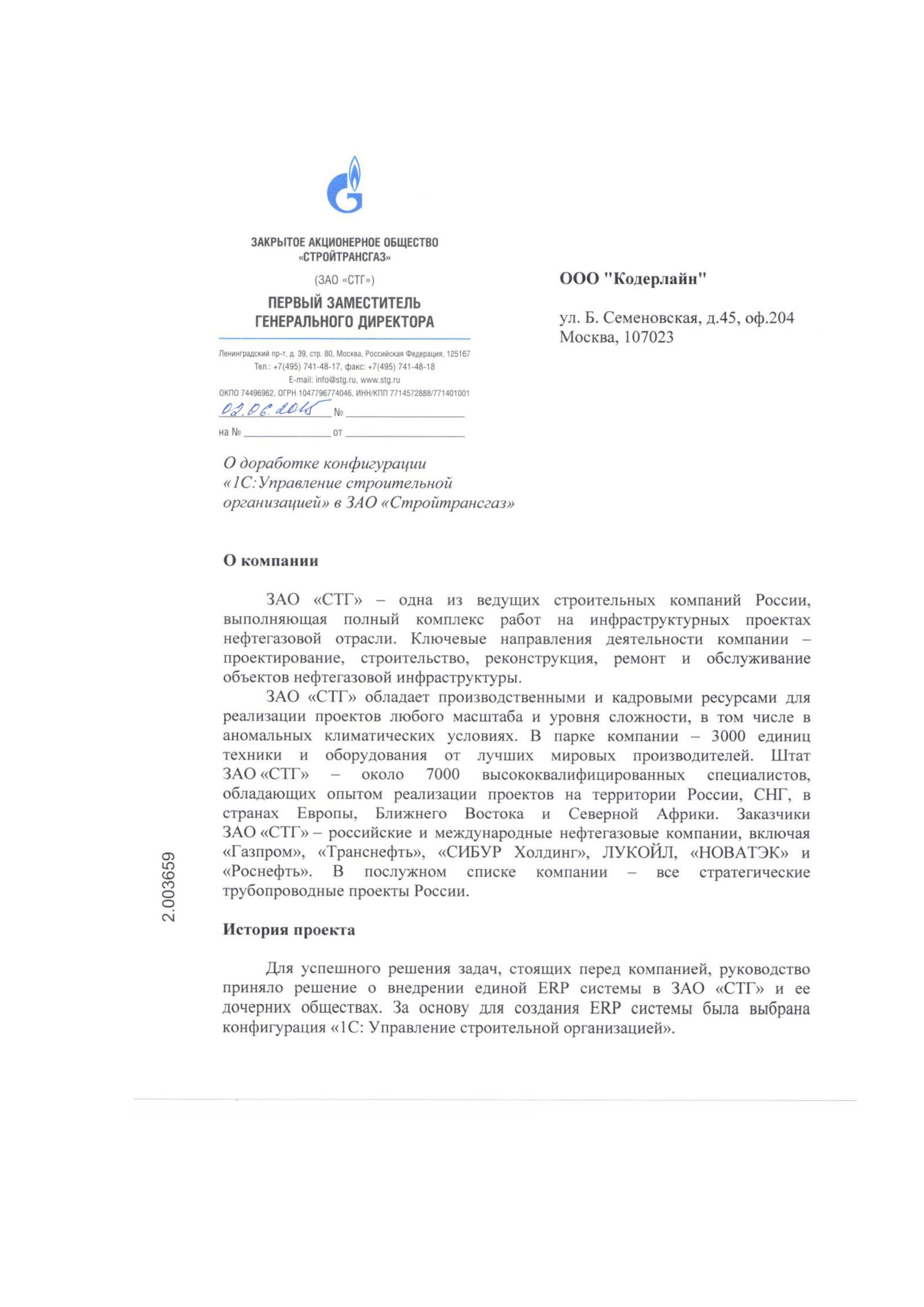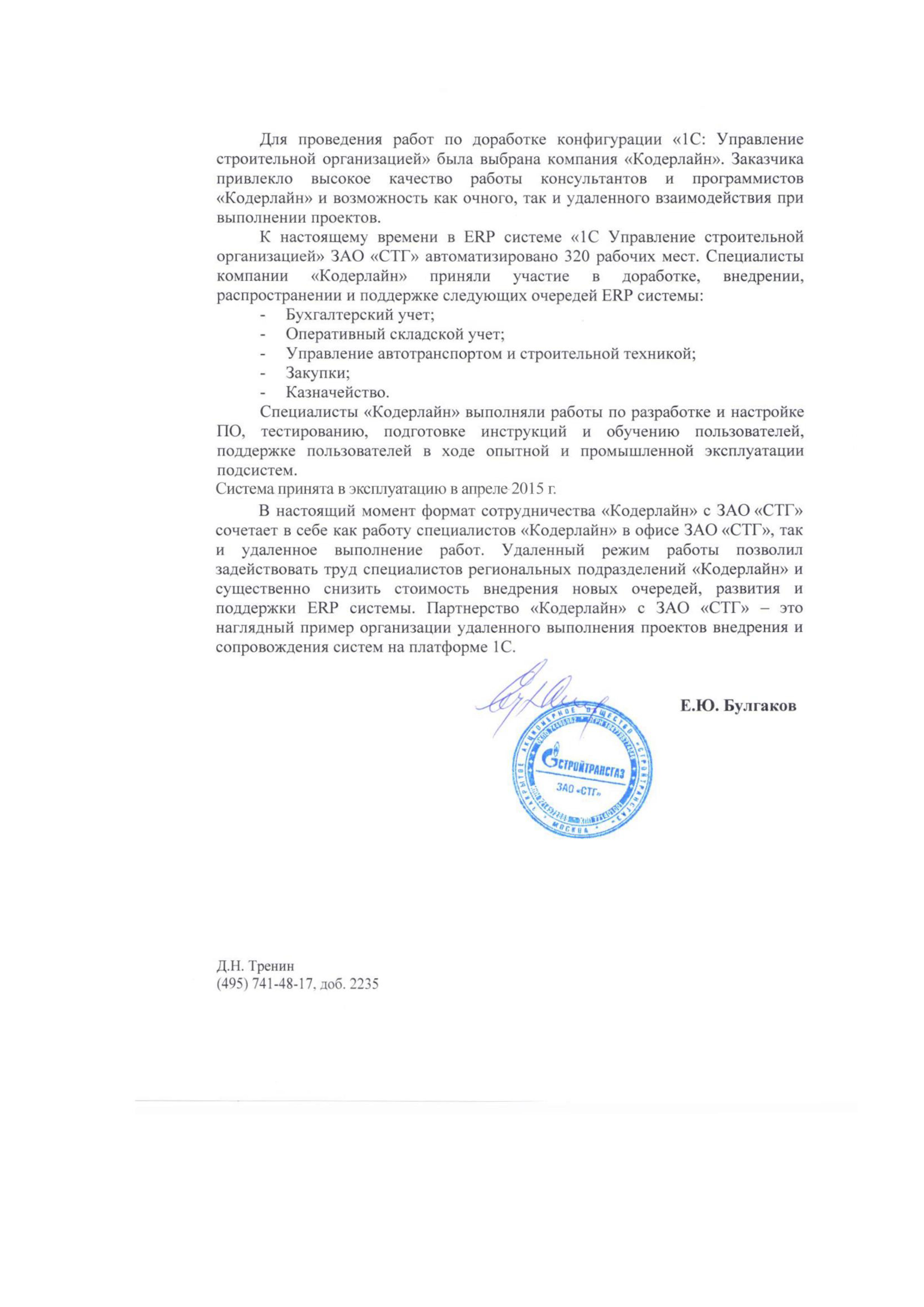 В настоящий момент формат сотрудничества "Кодерлайн" с ЗАО "Стройтрансгаз" сочетает в себе как работу специалистов "Кодерлайн" в офисе ЗАО "Стройтрансгаз", так и удаленное выполнение работ. Удаленный режим работы позволил задействовать труд специалистов региональных подразделений "Кодерлайн" и существенно снизить стоимость внедрения новых очередей, развития и поддержки ERP системы. Партнерство "Кодерлайн" с ЗАО "Стройтрансгаз" - это наглядный пример организации удаленного выполнения проектов внедрения и сопровождения систем на платформе 1С.